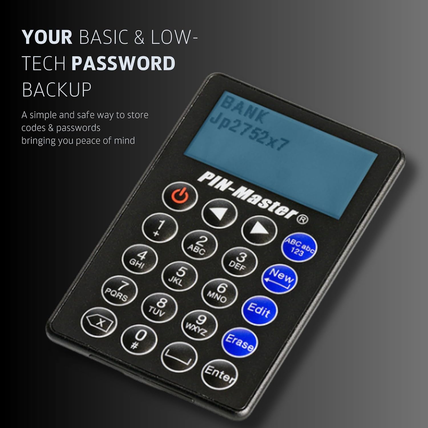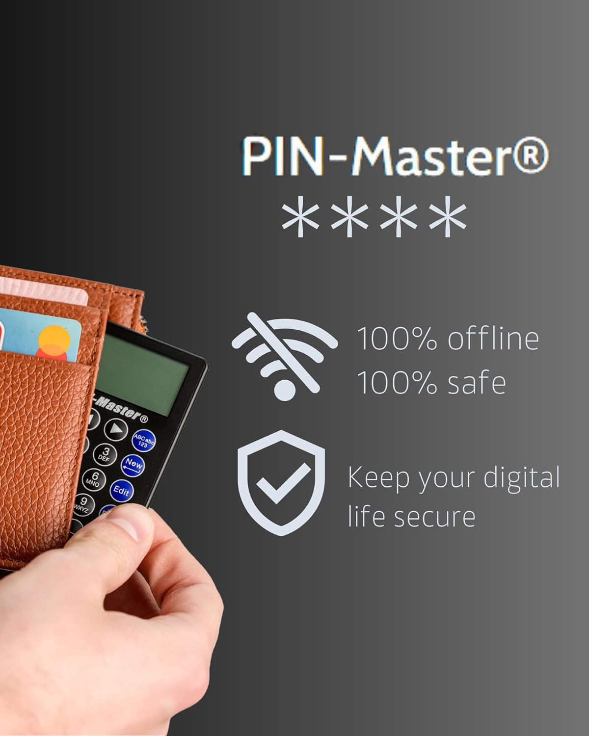 PIN MASTER securely stores up to 150 passwords (60 characters each) in a credit card-sized device (8.6 cm x 5.4 cm) that fits in your wallet. Built from sturdy metal alloy, it features a large 4-line display, intuitive interface, and master code protection—erasing data after four incorrect attempts. Fully offline and hack-proof, it’s the ultimate portable and secure password solution.